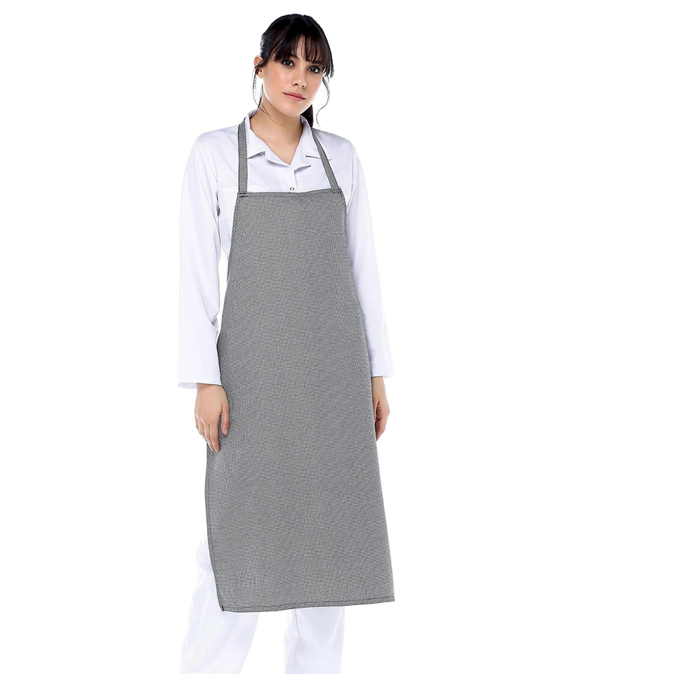 Gri-beyaz pötikare desenli, askılı ve unisex mutfak önlüğü. Şık görünüm, pratik kullanım.